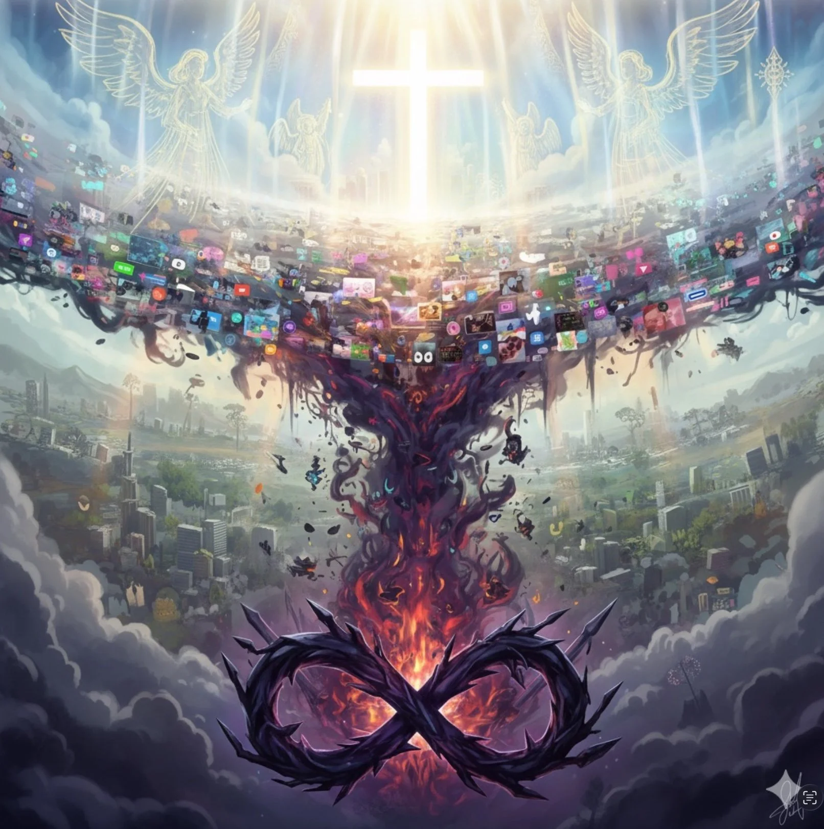 My first panic attack was terror; the second visualized its cause—an infinite figure-8 loop of panic. Later attacks revealed a radiant cross shattering this loop, claiming victory. Overwhelmed with devotion, I saw His thoughtful plan. My cross necklace, atop a chain, symbolized the cross dominating the figure-8. Casting out darkness in His name, I felt black smoke leave my body. Suffering stemmed not from hate but love.